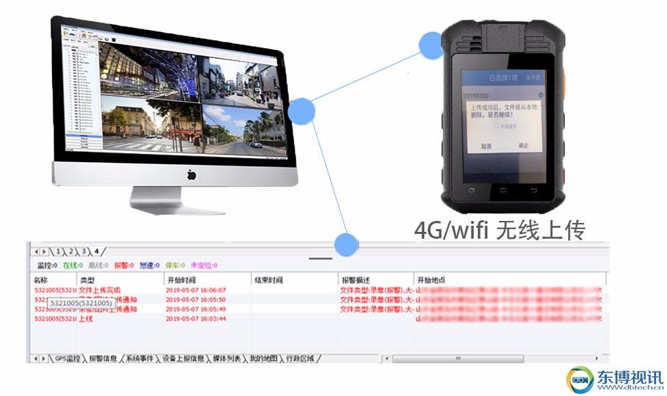东博视讯提供的执法仪设备采用安卓系统,高通八核处理器,系统运行稳定可靠,触摸屏操作,使用人员上手即会,无需繁琐操作。设备支持账号切换,可满足三班倒多人使用的同一台机器的状况,后台针对不同设备号进行资料的分类存储管理,便于后期的调取查看。